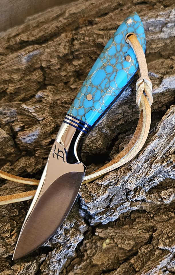 7 inch Recurve Cowboy Knife with Nitro V Stainless Steel Blade, 416 Stainless Bolster, Stainless Inlay, and Turquoise Recon Stone Scales.