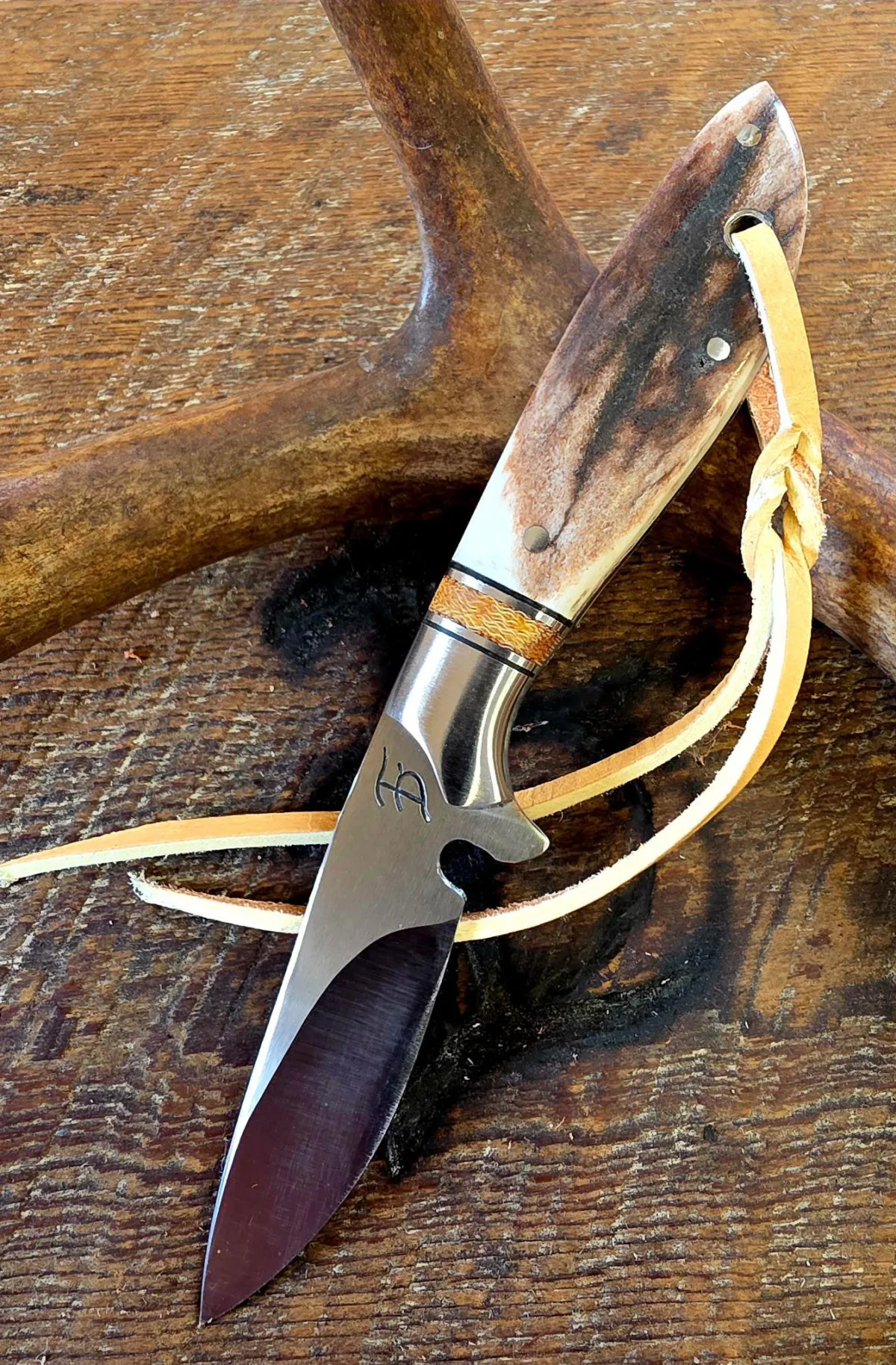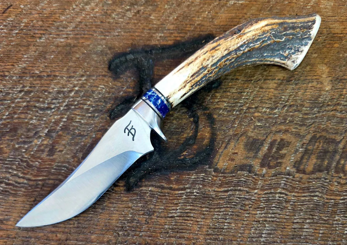 7 inch Recurve Cowboy Knife with CPM 154 Stainless Steel Blade, 416 Stainless Bolster, Stainless Inlay, and Sandbar Stag Scales.
